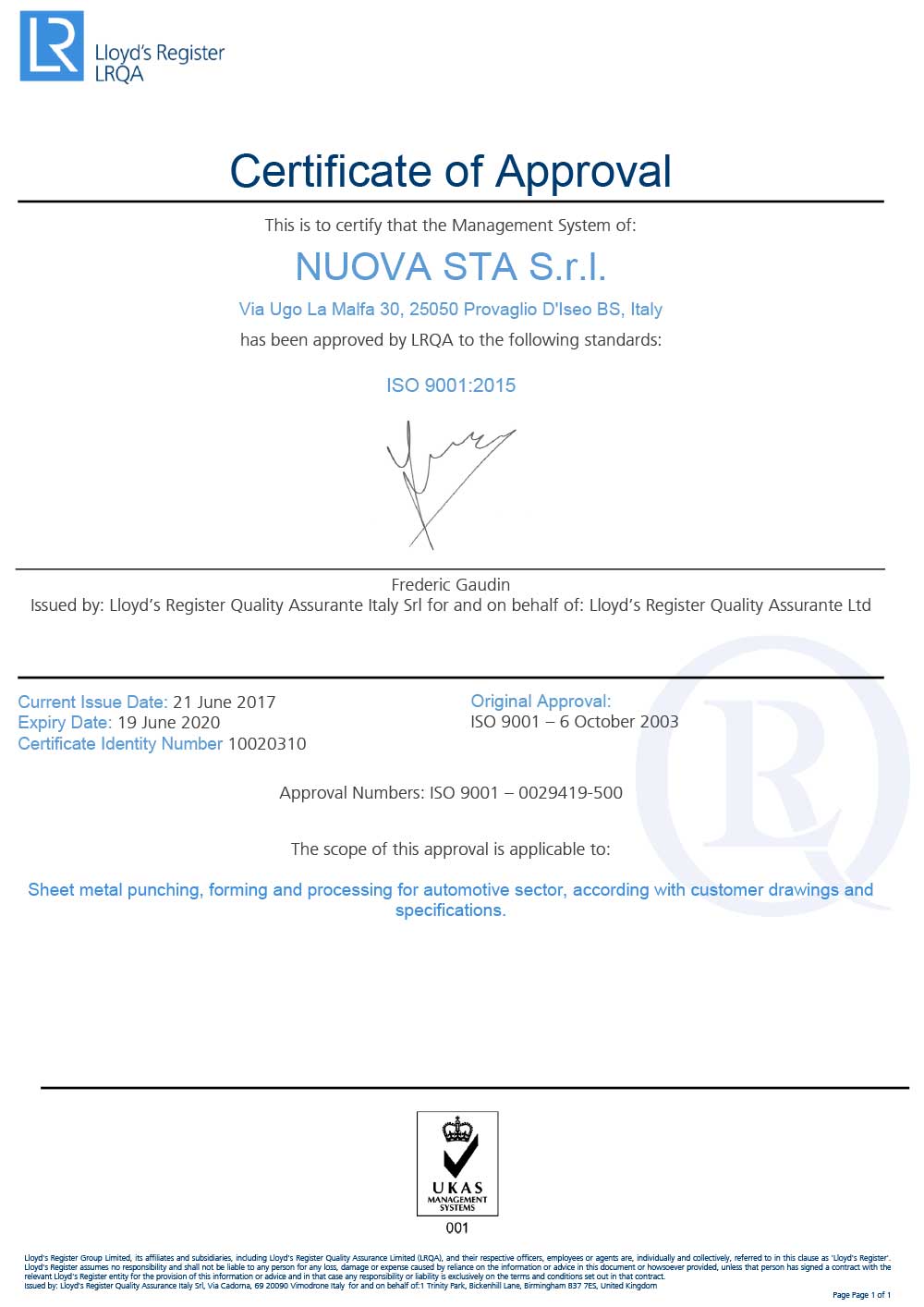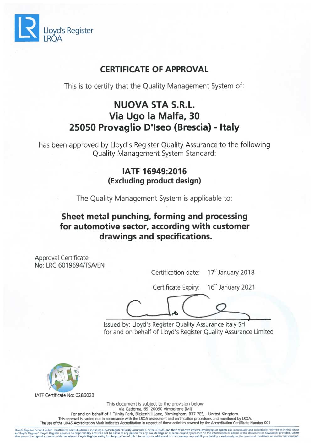 The quality management system of Nuova Sta is aimed at defect prevention, hence its specific focus on product development and industrialization. The dedicated staff work together with the engineering department all along the APQP process and are responsible for the approval of the product / process in compliance with all the requirements associated with PPAP activities (Production Part Approval Process) for the initial customer sampling.